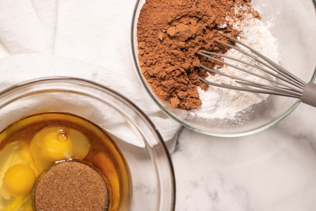 - In a medium mixing bowl, combine flour, cocoa powder, baking powder, and salt. Set aside.