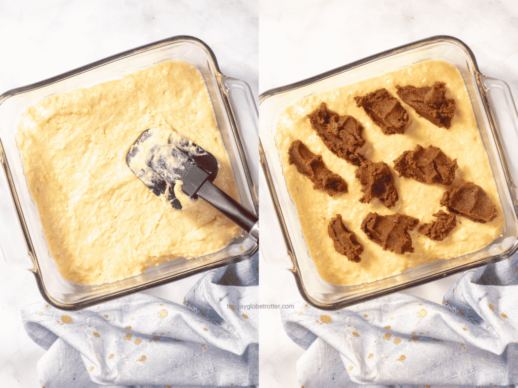 - Drop spoonfuls of the cinnamon topping on the cake batter. Use a toothpick to swirl it into the batter, kind of like cinnamon rolls.