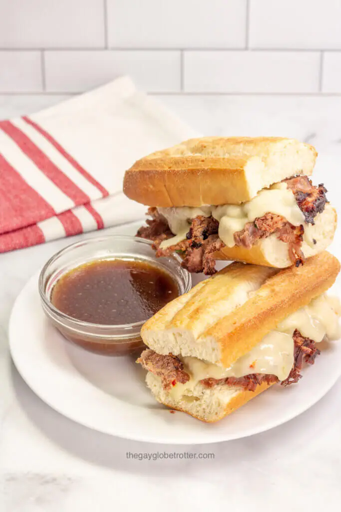 These easy homemade French dip sandwiches are comfort food heaven. Smoked beef brisket is layered with monterey jack cheese on a crusty baguette and served with a quick homemade au jus for dipping.