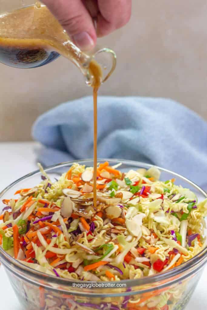 Most ramen noodle salad recipes use the chicken seasoning packet in the ramen noodles, but I have been working to cut back on my MSG intake this year. I’ve created this Asian sesame dressing that goes perfectly with the freshness of the cabbage.