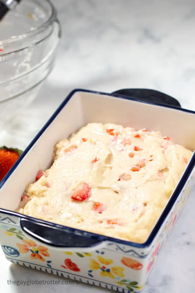 - Make the batter – combine flour, baking powder, and salt. Add the strawberries to a bowl, and toss them with a couple tablespoons to coat evenly. This prevents them from sinking when the bread is baked.