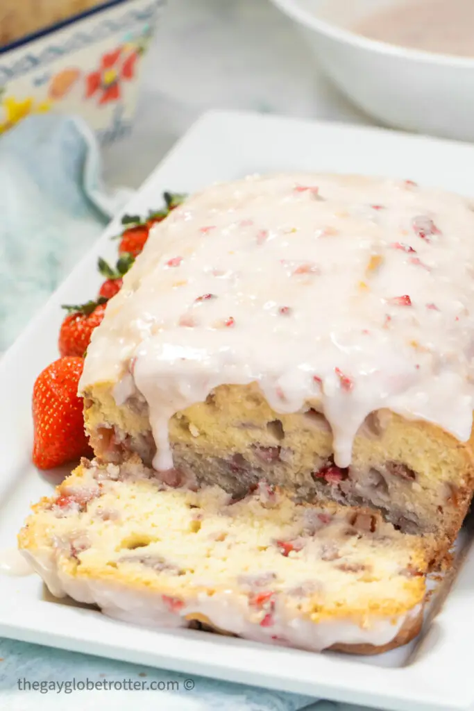 This strawberry bread with glaze is made with fresh strawberries, and topped with an easy strawberries and cream glaze.